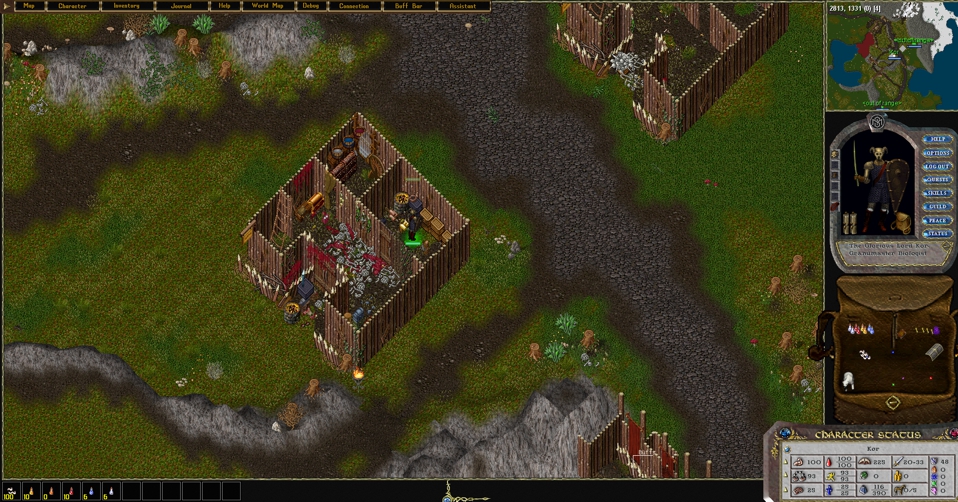The Menu Bar can be expanded or collapsed by clicking on the arrow graphic on the left side of the Menu Bar. The Menu Bar can also be toggled on or off through the paperdoll Options / Gumps & Context / Disable Menu Bar check box.