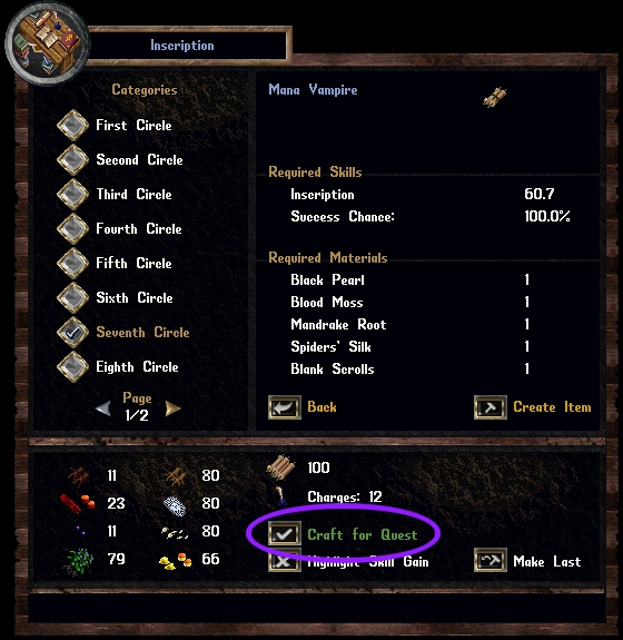 | Crafting | Toggle “Craft for Quest” in crafting gump. |